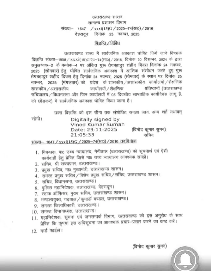 देहरादून: उत्तराखंड शासन ने गुरु तेग बहादुर शहीदी दिवस के उपलक्ष्य में घोषित सरकारी अवकाश की तिथि में बदलाव किया है। पहले यह अवकाश सोमवार, 24 नवंबर 2025 के लिए घोषित किया गया था। लेकिन अब शासन ने आदेश संशोधित कर अवकाश तिथि को मंगलवार, 25 नवंबर 2025 कर दिया है। इस संबंध में सचिव विनोद कुमार सुमन ने आधिकारिक आदेश जारी कर समस्त शासकीय विभागों, कार्यालयों, संस्थानों और शिक्षण संस्थाओं को सूचित किया है।गुरु तेग बहादुर साहिब सिख धर्म के नौवें गुरु थे, जिन्होंने धार्मिक स्वतंत्रता और मानवाधिकारों की रक्षा के लिए अपना बलिदान दिया। उन्हें ‘हिन्द की चादर’ के रूप में जाना जाता है, क्योंकि उन्होंने धर्म की रक्षा के लिए अपने प्राण न्यौछावर किए थे। हर वर्ष उनकी शहादत दिवस पर देशभर में श्रद्धांजलि कार्यक्रम और धार्मिक सभाएं आयोजित की जाती हैं।